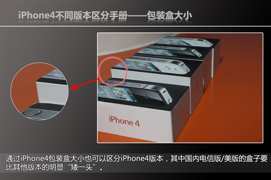 通过iPhone 4包装盒大小也可以区分iPhone 4各个版本,其中国内电信版/美版的盒子要明显比其它版本“矮一头”。
