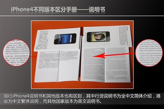 国行iPhone 4说明书和其它版本也有区别,其中行货说明书为全中文简体介绍,港行为中文繁体说明,其它国家版本则为英文说明书。
