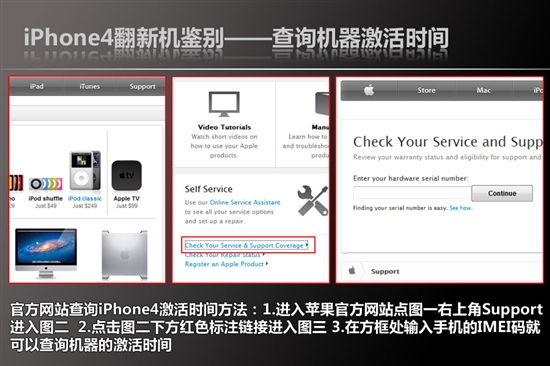 官方网站查询iPhone 4激活时间方法:1.进入苹果官网点击图一右上角Support进入图二 2.点击图二下方红色标注链接进入图三 3.在方框处输入手机的IMEI码就可以查询机器的激活时间。