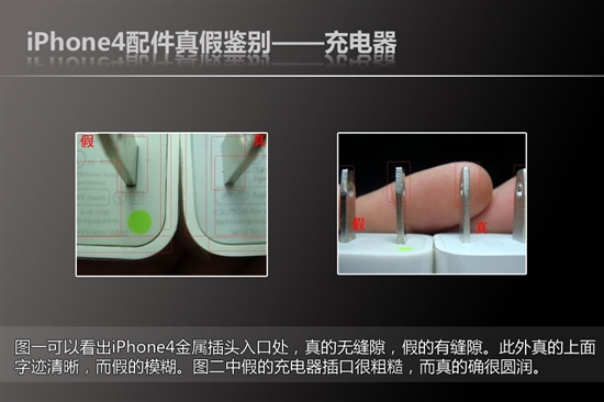 图一可以看出iPhone 4金属插头入口处,真的无缝隙,假的有缝隙。此外真的上面字迹清晰,而假的模糊。图二中假的充电器插口很粗糙,而真的很圆滑。