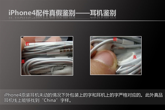 iPhone 4原装耳机未动的情况下外包装上的字和耳机上的字严格对应。此外真品耳机线上能够找到“China”字样。