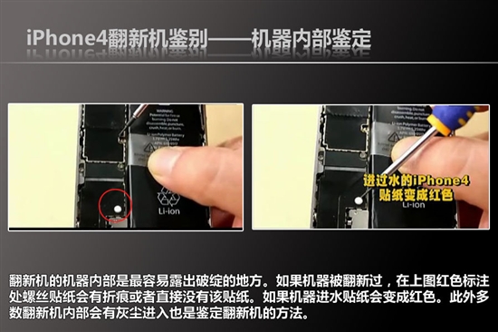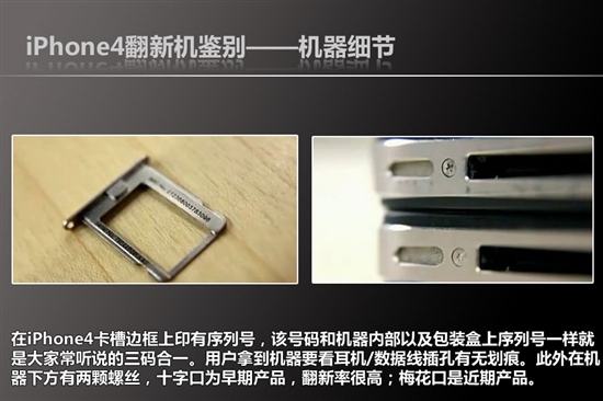 在iPhone 4卡槽边框上印有序列号,该号码和机器内部以及包装盒上的序号完全一致就是大家经常说的三码合一。用户拿到机器要看耳机/数据线插孔有无划痕。此外在机器下方有两颗螺丝钉,十字口为早期产品,翻新率很高;梅花口为近期产品。