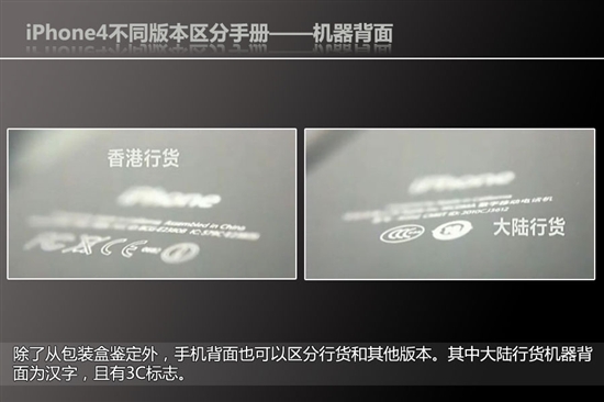除了从包装盒鉴定外,手机背面也可以区分行货和其他版本。其中大陆行货机器背面为汉字,且有3C标志。