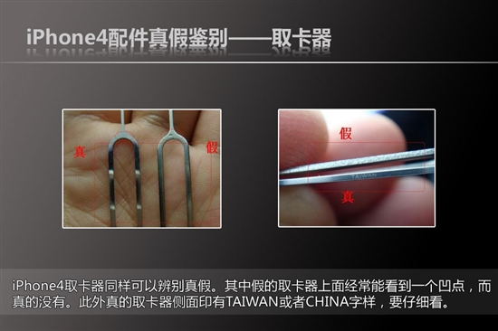 iPhone 4取卡器同样可以鉴别真假。其中假的取卡器上面经常能够看到一个凹点,而真的没有。此外真的取卡器侧面印有TAIWAN或者CHINA字样,要仔细看。