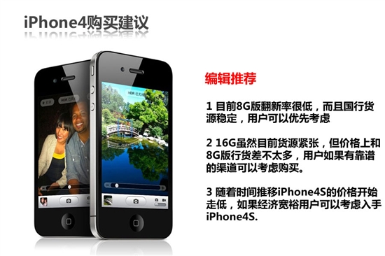 目前8G版翻新率很低,而且国行货源充足稳定,用户可以优先考虑。16G虽然目前货源紧张,但价格上和8G版行货相差不多,用户如果有靠谱的渠道可以选择购买。随着时间推移iPhone 4S的价格开始走低,如果经济宽裕用户可以考虑直接入手iPhone 4S。