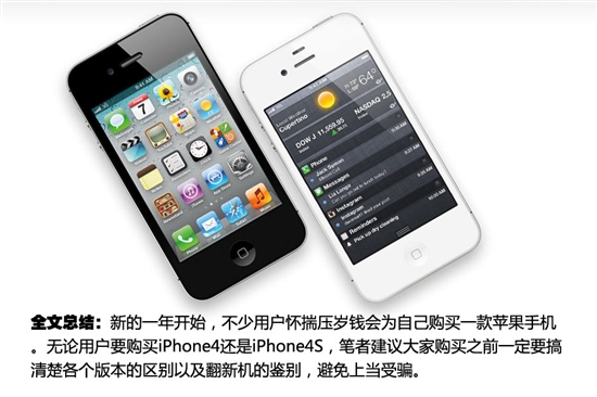 新的一年开始,不少用户怀揣压岁钱会为自己购买一款苹果手机,无论用户要购买iPhone 4还是iPhone 4S,笔者建议大家一定要搞清楚各个版本的区别以及翻新机的鉴别,避免上当受骗。