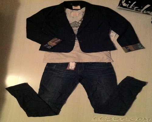 买2件再有9折,三件再8折,反正都好便宜的;里面的白色T好像100来块,外面西装折后HKD380元;牛仔裤折后HKD332元