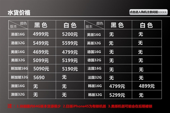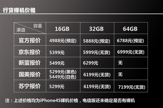上图中为iPhone 4S裸机销售价格,电信版还不确定是否有裸机存在。