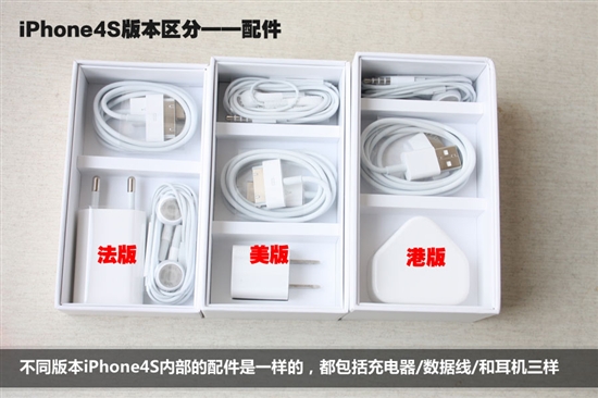 不同版本iPhone 4S内部的配件是一样的,都包括充电器/数据线/耳机三样,不过样式有些不同。