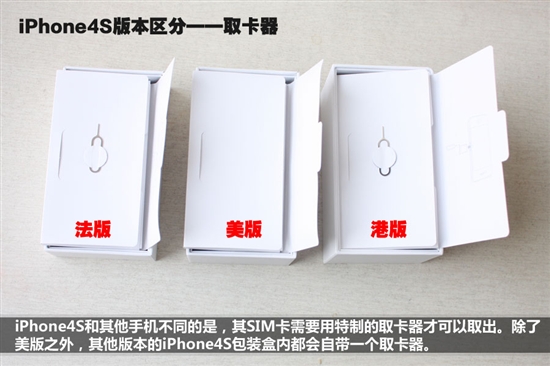 iPhone 4S和其它手机不同的是其SIM卡需要通过特殊的取卡器才能取出,除了美版之外,其它版本的iPhone 4S包装盒内都会自带一个取卡器。