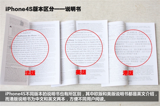 iPhone 4S不同版本的说明书也有所区别,其中欧版和美版说明书都是英文介绍,而港版说明书则分为中文和英文两种,方便不同用户阅读。