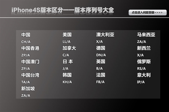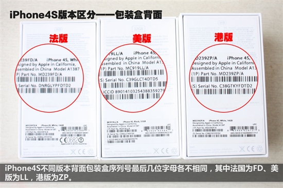 iPhone 4S不同版本背面包装盒序列号最后几位数字各不相同,其中法国为FD、美国为LL、香港为ZP。