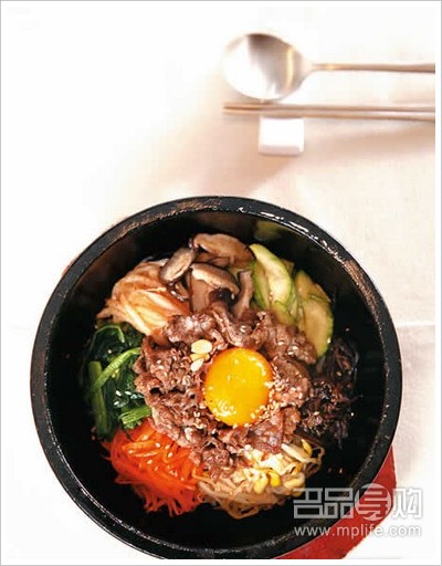 石锅牛肉杂锦拌饭 $110:韩国人午饭很爱吃,用上韩国米饭,加入五色材料包括木耳、冬菇、甘笋、菠菜、纽西兰手捣牛肉及鸡蛋,吃时要拌入韩国辣椒酱才够正宗。