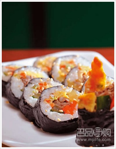 大厨来自首尔,老板蔡暎则是釜山人,太太来自光州,所以菜式集三地特色,也有他们自家的家乡菜。例如香港人甚少见的韩式紫菜饭卷,餐厅设有饭卷 counter,由总厨林小姐亲自以竹席卷饭团,入口只有芝麻油的香而没有日本寿司的醋香,吃起来很松软,更合中国人的胃口。