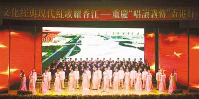 昨日是中华民族传统佳节——元宵节,为传播文化经典,唱响现代红歌,增强渝港文化交流,庆祝香港回归祖国15周年、重庆直辖15周年,重庆的13支群众演出队伍共计420人首次来到香港,与李明英、郑颖芬等香港艺术家和香港王华湘中学的学生等,同台献艺,表演了合唱、诵读、独唱等22个节目,共庆元宵佳节,其乐融融,充分展现了渝港和谐一家亲。