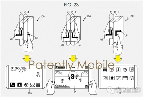 而在这项专利之前,我们还看到了三星对不同折叠设备的展开方式申请的更多专利。比如这项在2015年11月提交的专利。根据专利申请文件显示,设备将支持触摸手势的支持,用户必须触摸显示屏边缘上的图标,开展平板电脑。当平板电脑展开之时,某款特定的应用程序将自动启动。虽然专利申请文件没有具体说明是哪款应用程序,但是推测它一定和展开过程相关。
