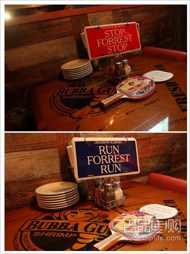 墙上挂着阿甘正传的电影海报,STOP FORREST STOP是等位线哈哈,值得一提的是,坐下后每桌都有一个示意牌,蓝色的写 RUN FORREST RUN,红色的写STOP FORREST STOP就是需要服务员来帮忙啦,