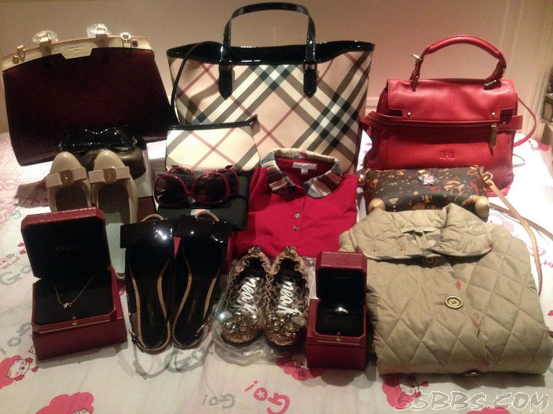 香港归来,卡地亚项链、戒指,LV漆皮包、凉鞋、BURBERRY包、衣服,GUCCI眼镜……