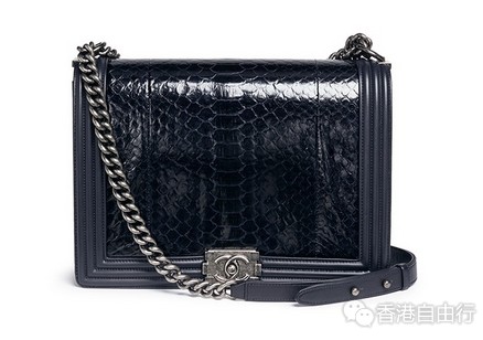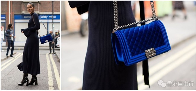 最近流行丝绒元素,运用在手袋上更加抢眼,摩登外型的Boy Chanel搭配宝蓝色丝绒更添华丽感,一件素色简约的连身裙配搭这个手袋,就能抢眼无比。