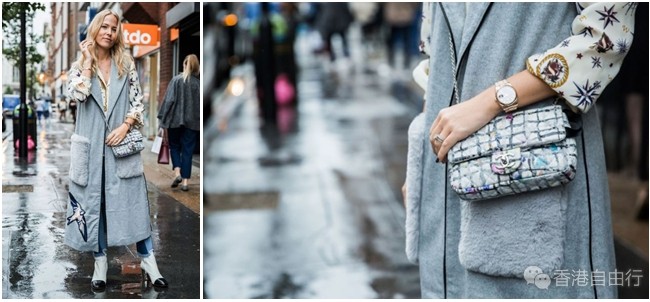 小一点的Chanel菱格纹手链袋,搭配起分量感十足的大衣,让视觉比例更有层次感,颜色上以统一的色调穿出时髦的一致性。