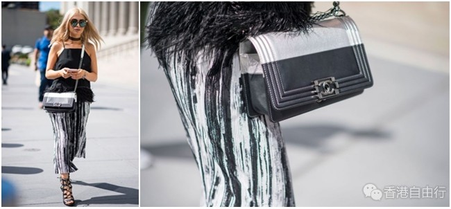 一身黑白的造型,不如带个也是双色撞色的手袋来搭配,黑色与银色组合的Boy Chanel摩登又有型。
