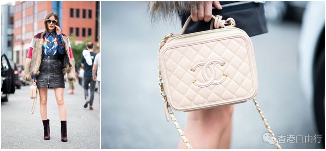 华丽的皮草大衣和抢眼的衬衫下,以一款优雅的裸肤粉色Chanel手袋来搭配,典雅的外型不抢走服装搭配重点。