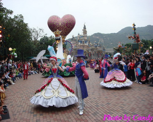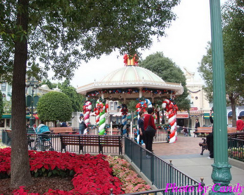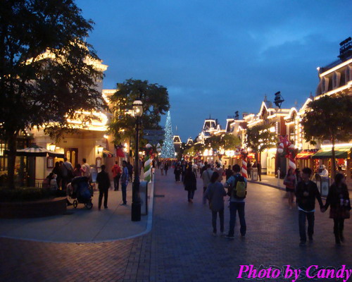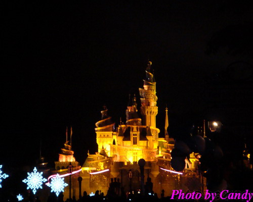 开始前大家就都聚集到美国小镇,然后园子里的灯会熄灭,只有圣诞树,街道两旁员工手持的灯和睡公主城堡是亮的