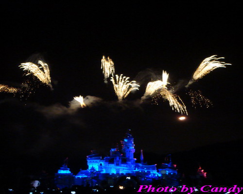 8点会燃放焰火,其实焰火没有什么特别的,但燃放过程中会伴随音乐和灯光,睡公主城堡的颜色会变换,配合的很好,还是有点儿童话世界的感觉的