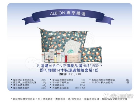 又到了一年当中女人花钱最不眨眼的万恶週年庆!今次周年庆ALBION预备了多款护肤及化妆品套装给各位fans,而购买正价产品满HK$2,500*会有14件装护肤体验套装送!