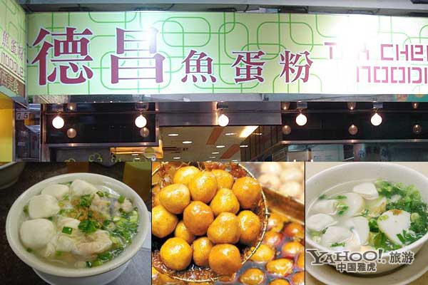 德昌鱼蛋粉店是香港一家出名的小吃店,鱼丸是这里的招牌,曾获过2001年“美食之最大赏”小吃组的至高荣誉奖。小小的店面不过八九张桌子,四五个素不相识的人挤在桌子旁,如果点的多一点儿,桌上放不下,必须尽快吃完。好像很多年前那种国营的老字号,这边几个人吃,边上就站着几个等座的。德昌的门口还是有人等座,老板也不催你,等的人也极有耐心。鱼皮饺的汤头很足,云吞面里虾仁个大饱满,足有完整的两三个。香港人极爱吃鱼丸,这里的个大筋道,用料实在,不像有些家的用面粉来掺。