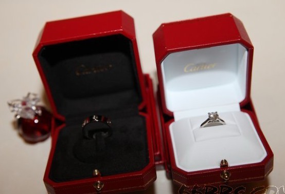 我们的婚戒。边上的香水是cartier送的,瓶子很漂亮。