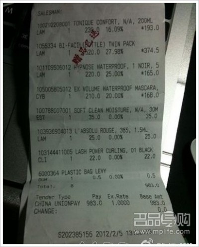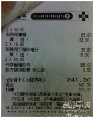 NIKE枚红色运动裤颜色是我的大爱375HK 梨牌润肤露和润手霜很好用经济实惠。最后一天在莎莎还买了两大瓶LANCOME的眼唇卸妆水还有睫毛膏,还有大粉瓶+一些小样,没照相有的送人了直接晒小票。公婆这次也很开心买了一人买了三双皮鞋婆婆居然还买到了一双真美诗的挺好的打完折1355HK,有我喜欢的款可惜没大号很郁闷,婆婆还买了一件意大利皮衣8000HK也挺美的没照相我们不住一起嘿嘿,最后在机场买了香烟和饼干巧克力还有几个迪斯尼的玩具带回来送人的(都已经送了没来及照相)