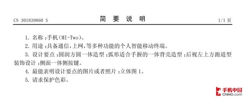 小米MI-Two外观专利说明