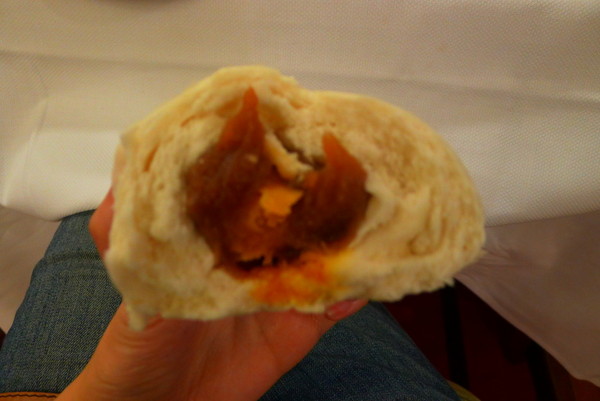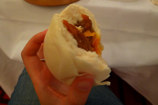 不忍心看到食物浪费掉啊,,最后这个包子实在吃不下了,服务员上来很友好提醒我可以尝尝里面的馅儿。。