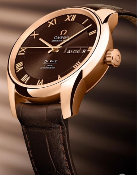 欧米茄碟飞系列年历表堪称经典风格的典范之作。41毫米18K红金表壳搭配棕色皮表带;棕色表盘上嵌有18K红金罗马数字小时刻度,十分醒目,月份和日期窗口位于3时位置。与超凡外观设计相比毫不逊色的是内部搭载的带有硅材质游丝的欧米茄同轴8611机芯。此款机芯带有年历功能,因此只需在每年3月1日调校一次日期。中央时针、分针和秒针同样采用18K红金材质。此款欧米茄碟飞年历表享有长达4年的售后服务保证。