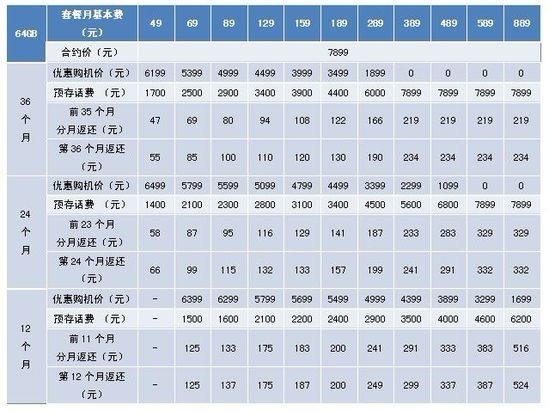 而64GB版iPhone4S则7899元,用户签约在网36个月的零元购机套餐月费门槛为389元;签约在网24个月的零元购机套餐月费门槛为589元;签约在网12个月暂无零元购机选择。