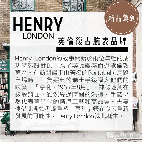 Henry London 的诞生由两位年轻设计师的伦敦复古灵感探索之旅程展开。在 Portobello Market 的一次偶遇,一隻气质优雅的复古瑞士腕表吸引了他们的目光,腕表的背面刻上了’ Henry, August 1965 ’。这隻手表虽充满岁月的痕跡,但非凡的工艺和品质依然在它身上表露无遗。两位设计师对这件无价之宝爱不释手,想重塑这隻复古瑞士腕表,而Henry London 品牌的诞生正正是在原版手表面世的50年之后。