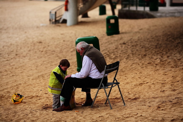 海滩上的祖孙俩,很是温馨的场景,小男孩一直缠着爷爷和他玩球,老人也乐在其中。