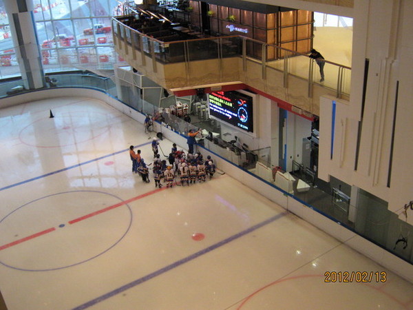 商场里有溜冰场! 冰~ 一群孩子练习打冰球。