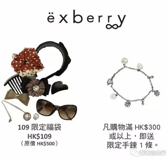 exberry特地为这次「109 Week」推出了福袋,当中包括戒指、颈鍊、太阳眼镜、髮夹、绑髮橡根等等,平时买一个太阳眼镜都不止$109这个价,所以说非常抵买!
