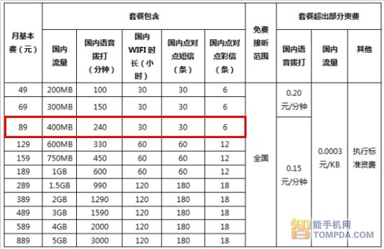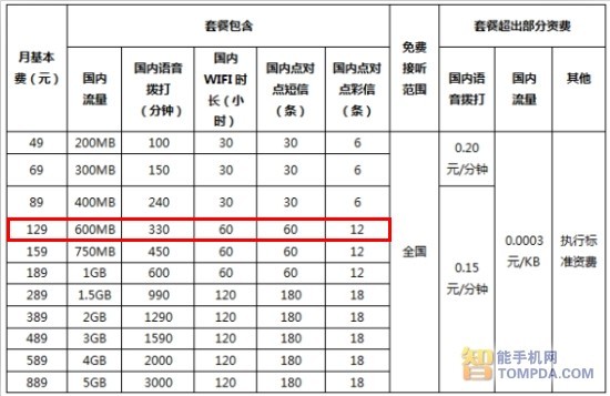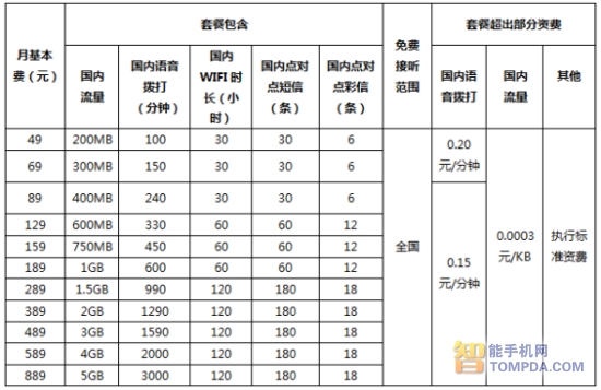 在最低49元套餐中,包含了200MB数据流量、100分钟语音时长、30小时WiFi时长、30条短信以及6条彩信;69元套餐包含300MB数据流量、150分钟语音时长、30小时WiFi时长、30条短信以及6条彩信,超出部分国内语音0.20元/分钟,流量0.0003元/KB。