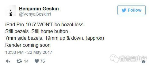 而现在爆料大神Benjamin Geskin在自己的社交媒体上曝光了一些关于新iPad Pro的一些消息。他表示这款10.5英寸的新iPad Pro将不会采用之前传说中的无边框设计,并且物理Home键将依然存在。因此在整体设计风格上,这款新iPad Pro应该与之前的产品大同小异,而更大的区别在出现在背面。