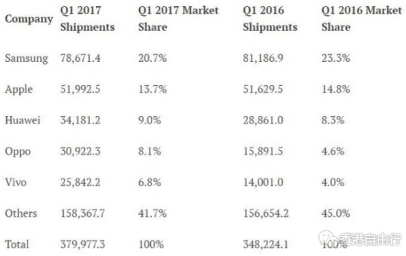 一点也不让人感到意外的是,苹果全球智能手机市场份额比上年同期下滑1.1个百分点至13.7%,中国智能手机三巨头——华为、Oppo和Vivo,市场份额则有大幅增长。