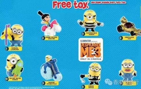 还有就是麦当劳为迎合《神偷奶爸3》在月底上映,所以本期开心乐园儿童套餐的换购玩具是小黄人主题。