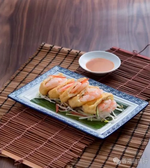 酿豆卜是星马两地非常受欢迎的街头小吃。Chef Khoo将豆卜制成福袋,然后酿入原只鲜虾及以芽菜、青瓜和生菜组成的沙律。外观金黄可爱而口感丰富。进食时可蘸上香辣花生酱,惹味可口。