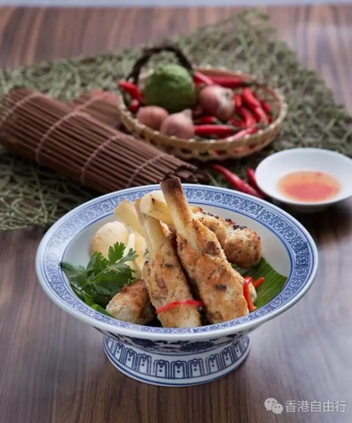 地道夜市小食-越南蔗虾的变奏,先把剁猪肉加入薄荷、洋葱及鱼露等调料,手打至起胶成肉酱,再沾裹着甘蔗枝香炸而成。猪肉肉质弹牙,比虾肉更能够吸收甘蔗的清甜,沾上青柠辣椒鱼露同吃,香辣而醒胃。
