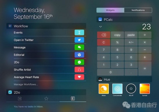 以前在 iPad 上苹果会将今日视图分成两栏,但这都是过去的事情了。在 iOS 11 中,widget 就出现在一栏中,而且是集中在屏幕中间的。不管是横屏还是竖屏模式,它都只有一栏,不像以前会分成两栏。