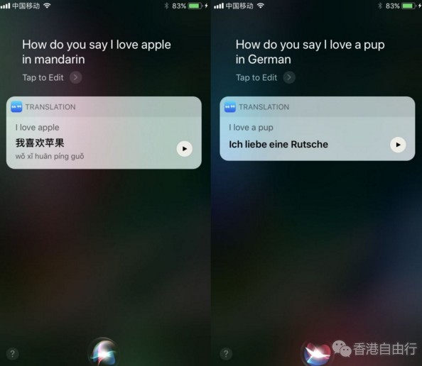 Siri 支持翻译了,可以直接帮你将英文翻译成中文。这点很遗憾,目前在国内还不支持原生中翻英翻译功能,而翻译英文到中文又需要将 Siri 语言设置为美国英语。也就是说,Siri 暂时只能帮你翻译英文成中文、西班牙语、法语、德语或意大利语。另外,毕竟是机器翻译,所以不可能十全十美,能够有目前的水平还算是可以了。