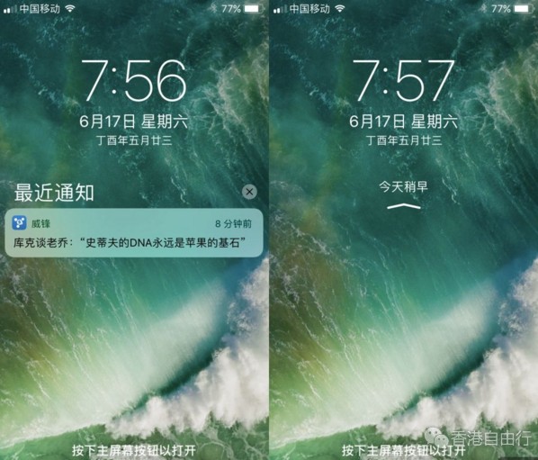 而在锁屏界面下,其主要的变化就是现在也可以向上滑查看最近的通知。另外,现在查看通知不是原本的向右滑动通知浮框了,而是直接轻触或点击就能进入应用中查看。相信锁屏和通知中心的明显调整,对于大多数人来说需要一定的时间去适应。其实我们也可以换句话来说,iOS 11 以特殊的方式支持快速锁屏了,操作方式就是原来下拉通知中心的手势。