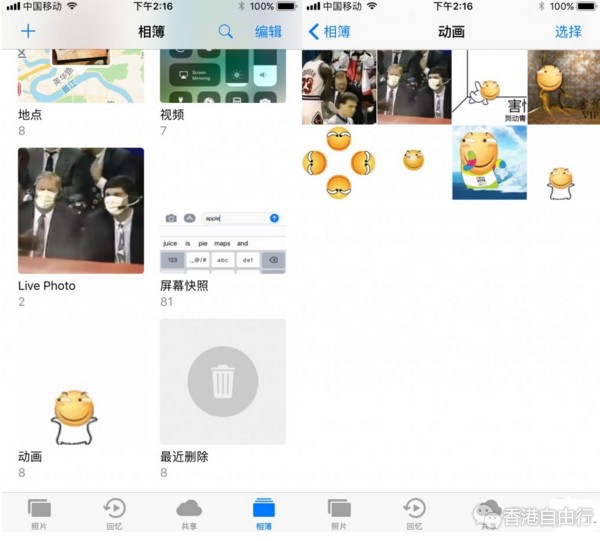 最让大家开心的一件事情应该是,照片应用默认支持查看 GIF 动画了,不再像之前那样为了流畅性而设置成静态照片。为了便于区别,相册中也多了一个动画的分组,便于查看和管理。